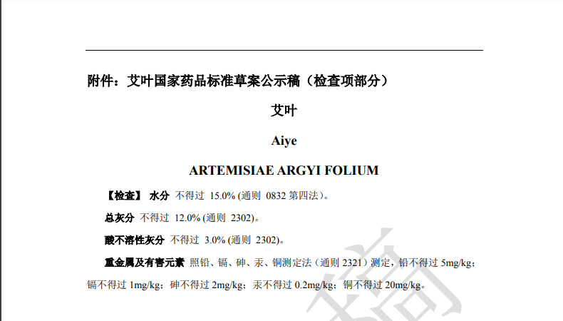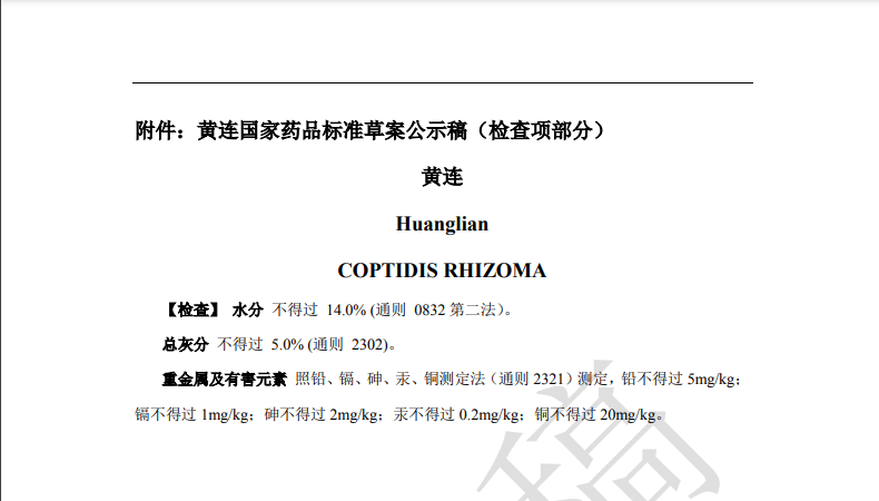 隨著《中藥法典》標(biāo)準(zhǔn)修訂進程的推進,藥典委官網(wǎng)近期陸續(xù)發(fā)布多個標(biāo)準(zhǔn)公示,均與中藥重金屬及有害元素控制相關(guān)。其中,“關(guān)于黃連國家藥品標(biāo)準(zhǔn)草案的公示”、“關(guān)于艾葉國家藥品標(biāo)準(zhǔn)草案的公示”、“關(guān)于川芎國家藥品標(biāo)準(zhǔn)草案的公示”,對相關(guān)檢測項擬進行修訂。公示期為30天。通知表示,若有異議,可及時在線反饋,并附相關(guān)說明、實驗數(shù)據(jù)和聯(lián)系方式。