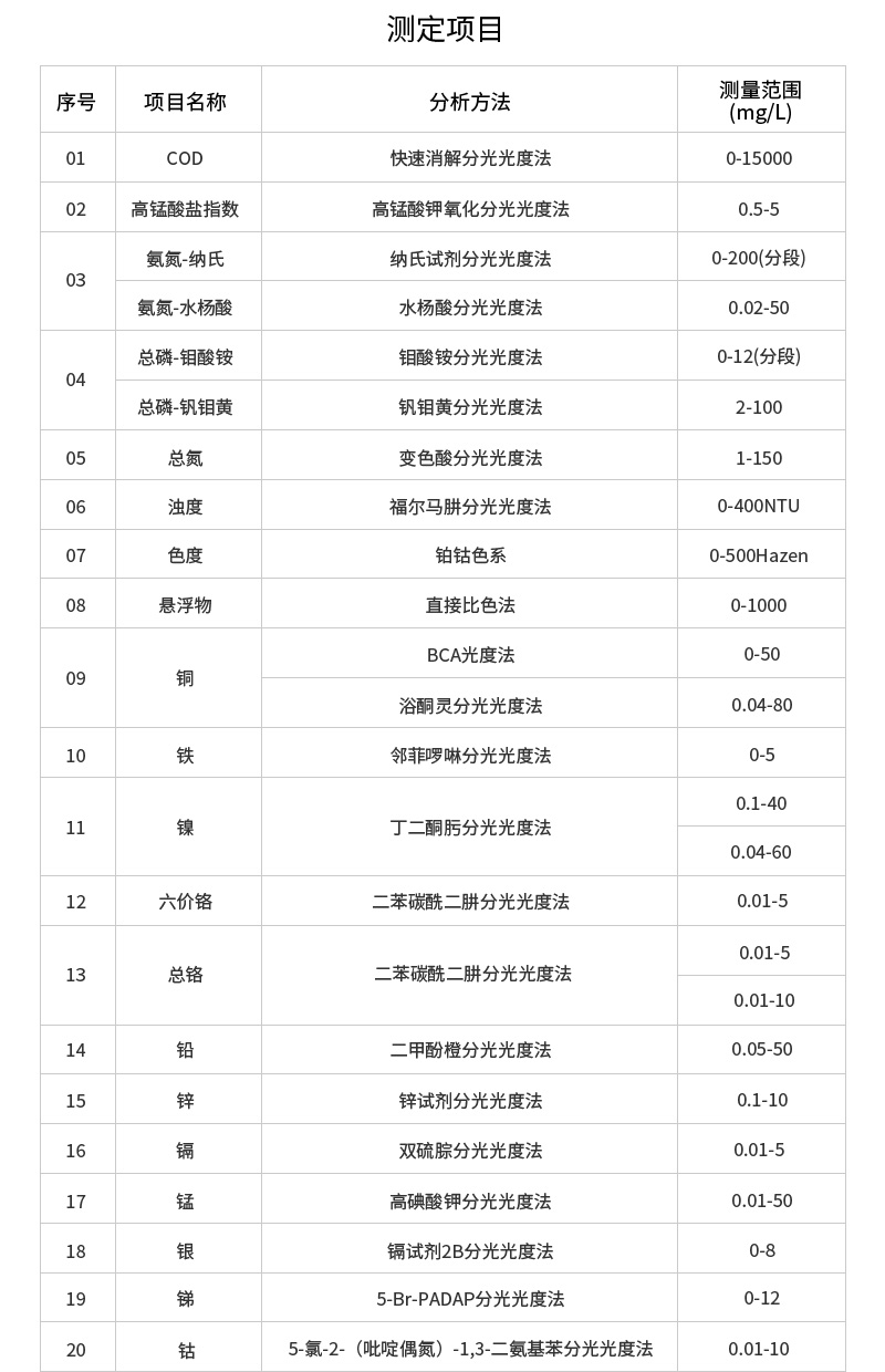 檢測限:COD高量程3mg/L;COD低量程0.5mg/L